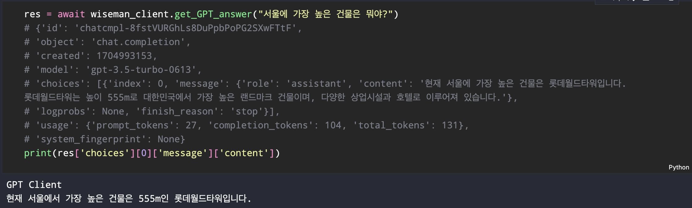 - LLMClient: GPT API를 사용해서 질문에 대해서 답변이 생성되는지 확인함.